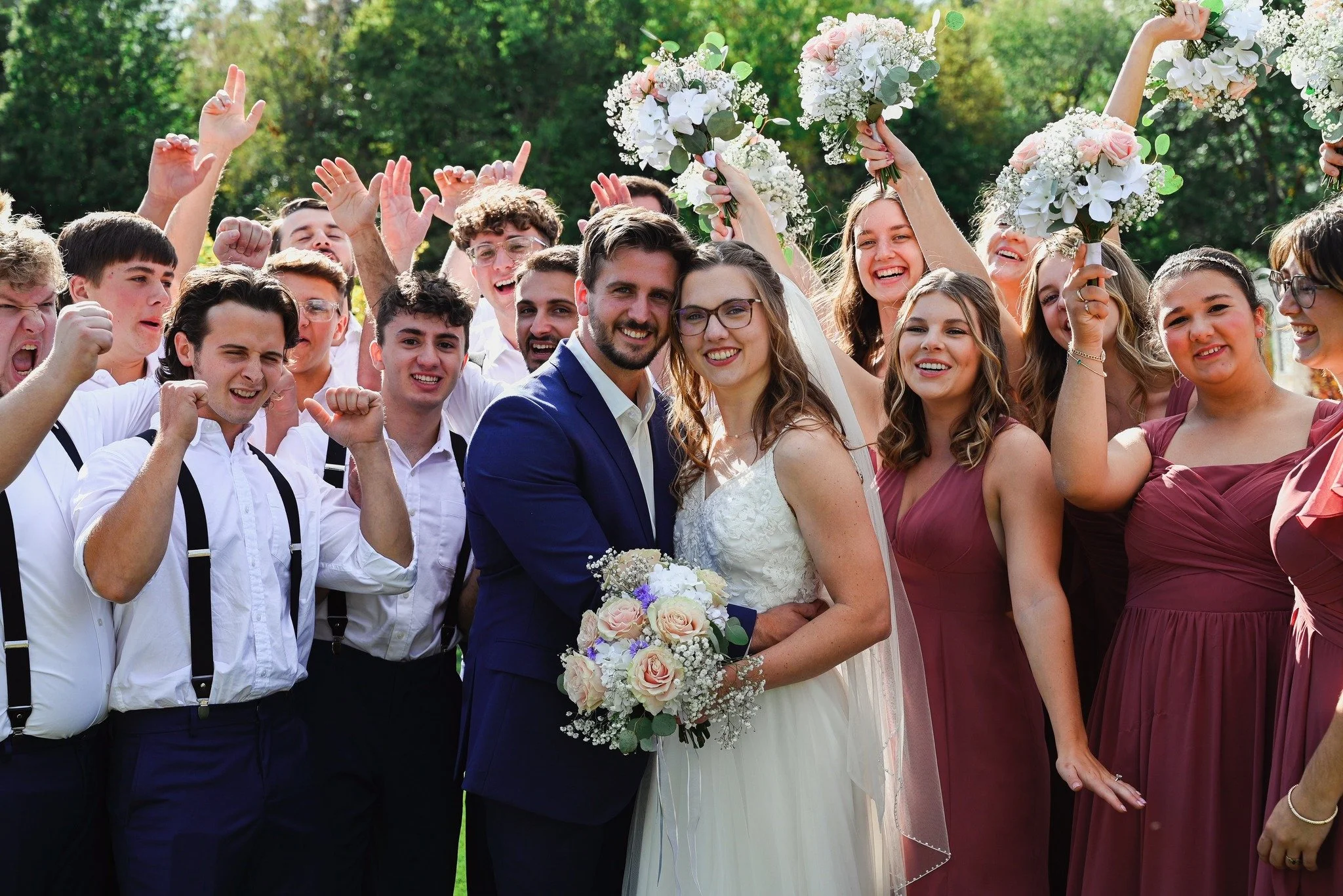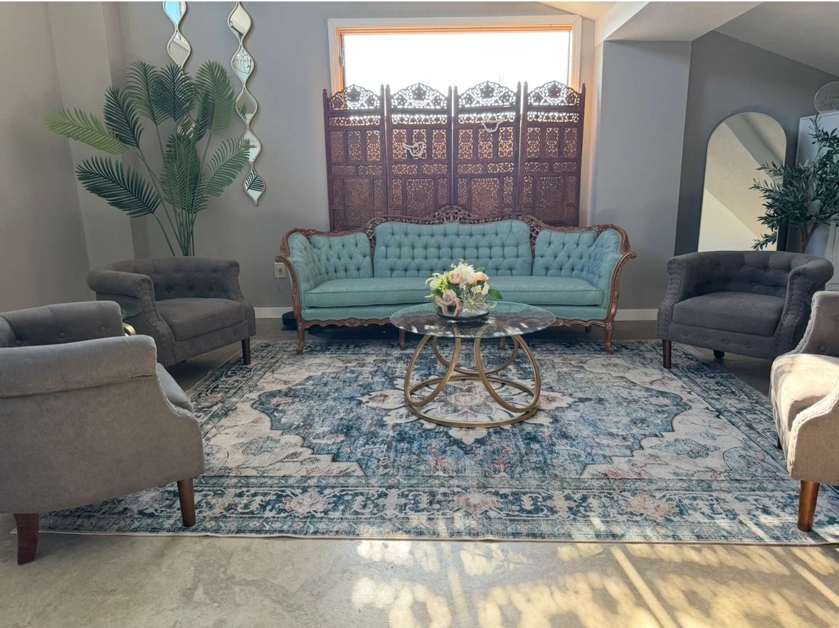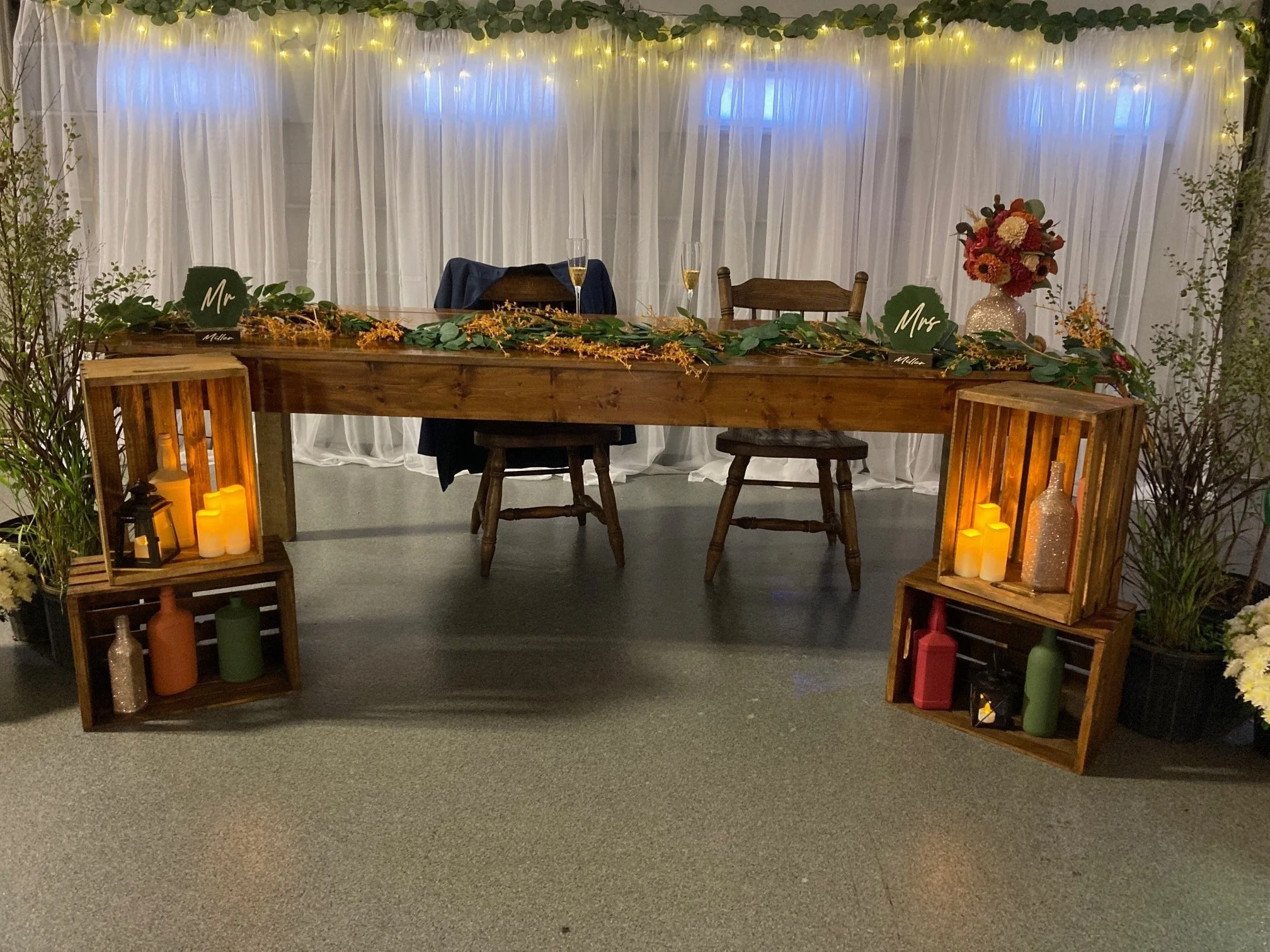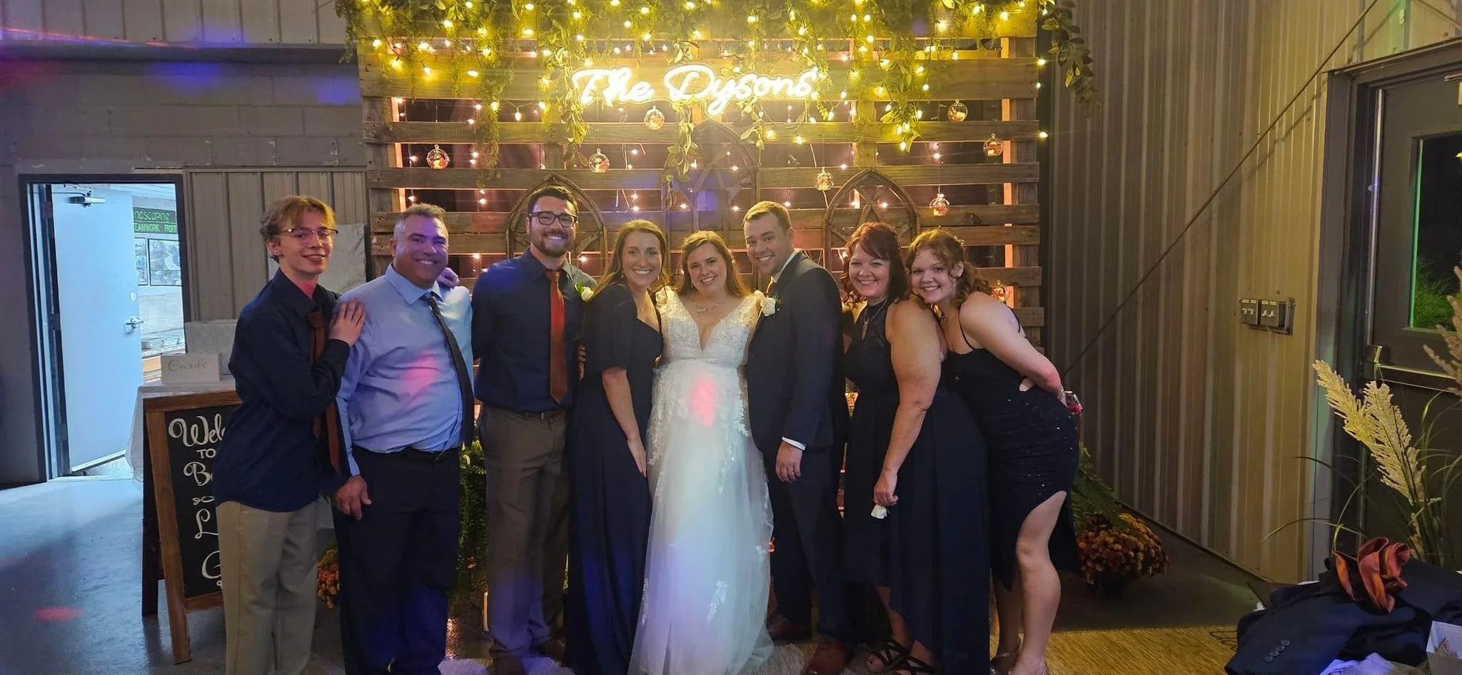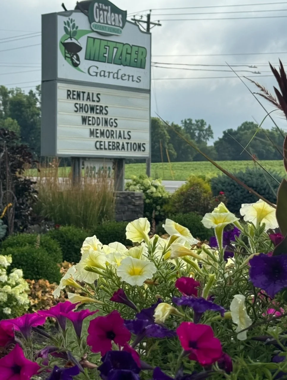 We make every moment memorable at The Gardens Wedding & Event Venue! You’ll discover our easy to find location on State Road 13 in North Manchester, Indiana. Metzger Gardens is a picturesque garden nursery and home to the most unique wedding event venue. Our wedding venue features a rustic round barn for your ceremony (no worry of wind or rain ruining your ceremony). The large Party Room reception hall includes market lights, globe sphere chandeliers, ceiling drape, disco lights, a rustic lighted pallet wall for photos & new handicap-accessible restrooms. Guest capacity is 300. A beautifully lighted 3-tier fountain anchors the center of the party room. Tables and chairs are available for your use. Beautiful new bridal suites for the wedding party to get ready in are on-site. Weekend Wedding Packages are available. Our Party Room is available for wedding receptions and special celebrations. Select decor items such as arbors, tablescapes, lighted wedding backdrops for the head table/cake table are available for rent. Ask about our icecream machine to add to your next event! We offer a lovely seasonal plant package utilizing flowering plants from our nursery to decorate the wedding barn & reception room—an affordable option that brides love to take advantage of.