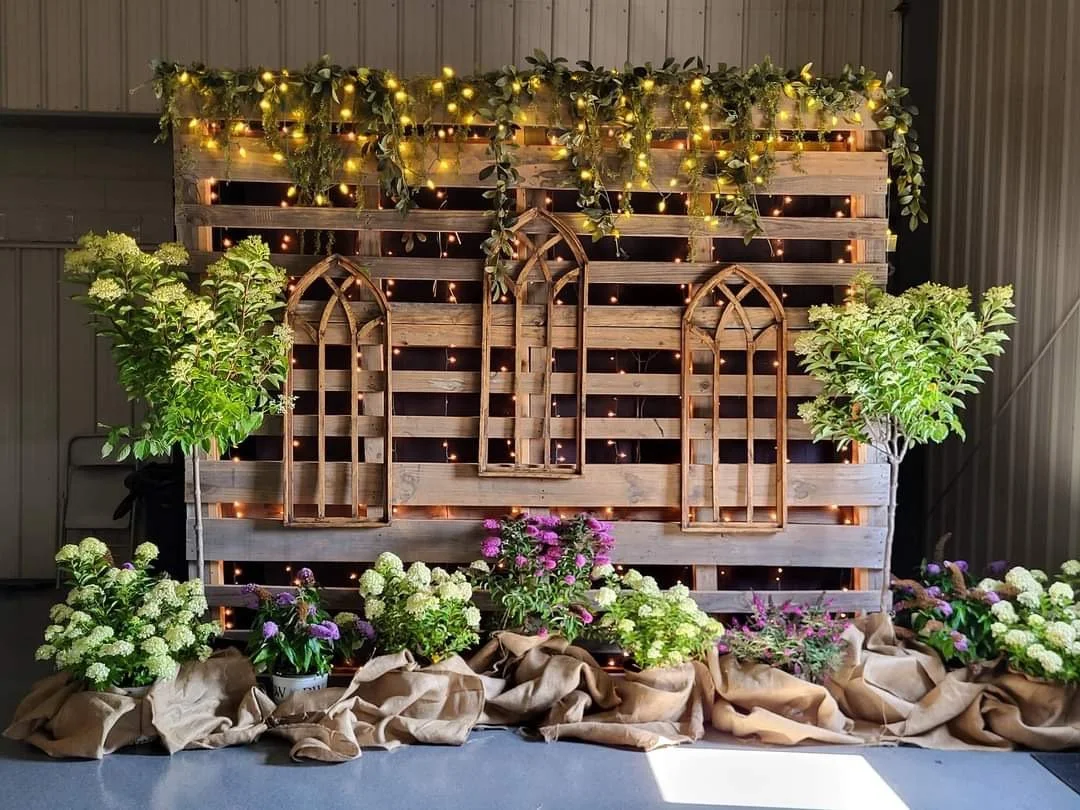 ~Beautiful outdoor arbors for photos & a lighted indoor pallet wall for guest photos